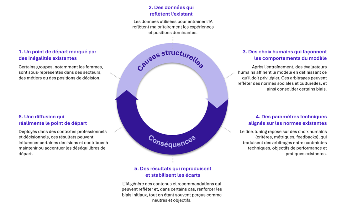 Afin de comprendre ce mécanisme, il convient de se pencher sur la manière dont ces modèles fonctionnent. Première chose à souligner, l’intelligence artificielle ne génère pas de biais ex nihilo. En effet, les modèles sont entraînés sur des corpus massifs (livres, articles, contenus en ligne) qui reflètent les inégalités et stéréotypes existants. Cette phase d’apprentissage est ensuite complétée par une étape de fine-tuning (ajustement) : des évaluateurs humains notent les réponses du modèle pour l’orienter vers les plus pertinentes. Mais ces jugements sont eux-mêmes socialement situés. À chaque étape (choix des données, critères de pertinence, définition de la « bonne réponse »), des biais peuvent s’introduire.